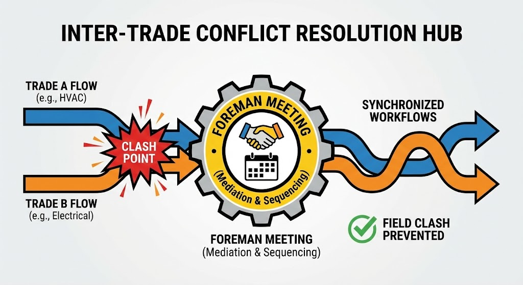 Conflicts are inevitable when multiple trades are squeezed into the same square footage. The foreman meeting is the designated “neutral ground” to resolve these. When a conflict arises, the superintendent should act as a mediator rather than a dictator. Focus on the Project Logic: ask which task is the “critical path” driver. If the drywall can’t start until the piping is pressure-tested, the logic dictates the pipe-fitters get priority.