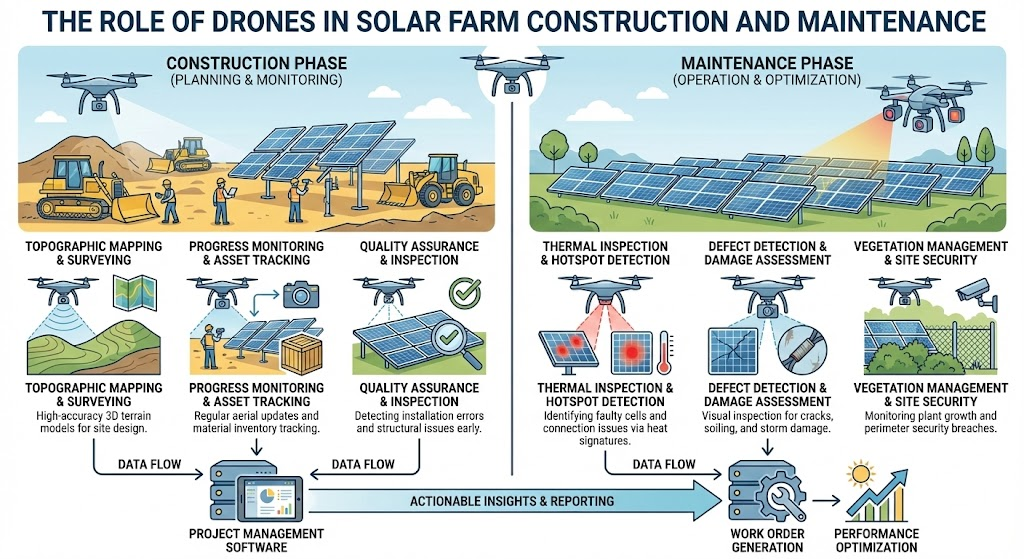 Drones have become indispensable tools in solar farm construction and maintenance, improving site planning, quality control, and long-term asset management. By providing high-resolution imaging, thermal scanning, and aerial mapping, drones help teams make faster, more informed decisions throughout the project lifecycle.