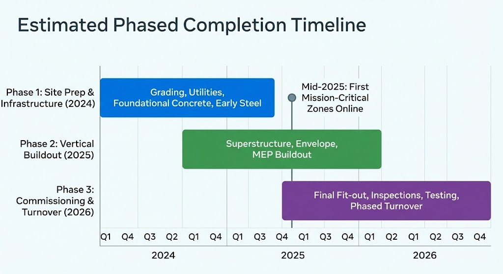 This phased delivery approach allows Meta to begin commissioning data halls, installing networking infrastructure, and testing power systems long before the entire site is complete. By mid-2025, it’s likely that portions of the facility will begin operations, while additional areas continue through MEP buildout, interior fit-outs, and systems integration.