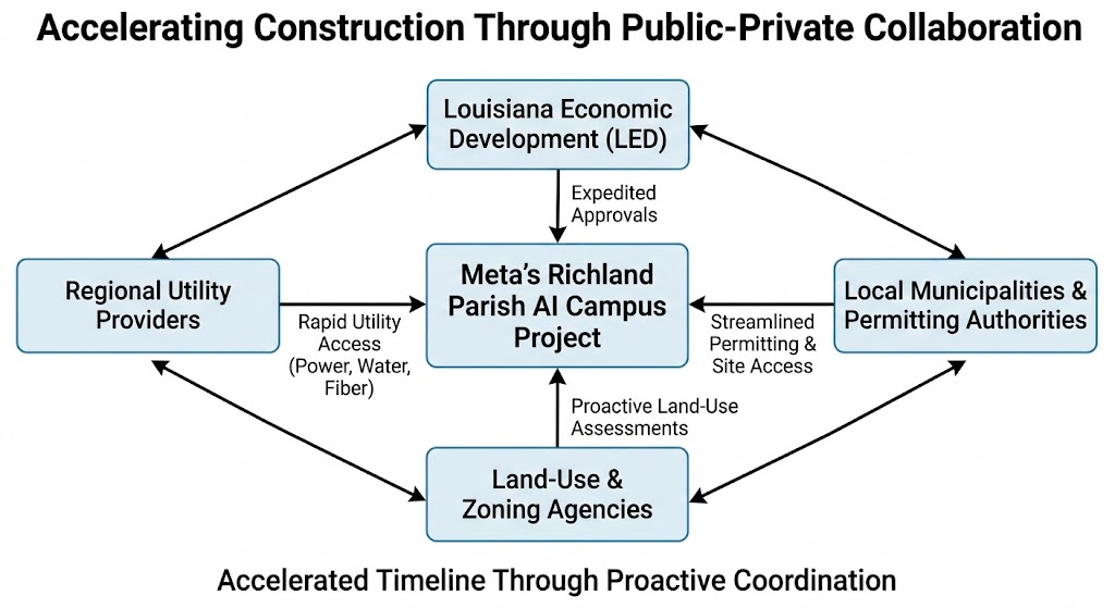 Public agencies have played a critical role in keeping Meta’s Richland Parish timeline on track. State and local governments, utilities, and permitting authorities coordinated closely with Meta’s project team during the early planning phase to fast-track approvals and infrastructure delivery.